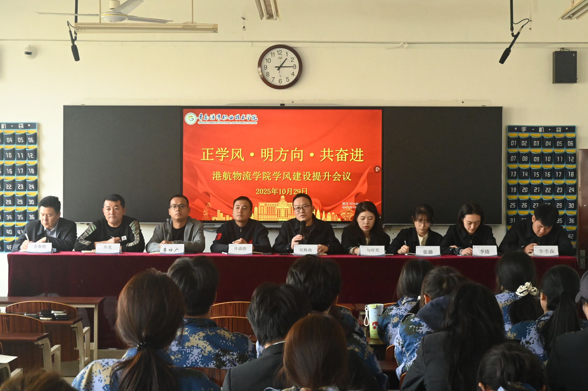 会上,勾仔芃宣读了《青岛港湾职业技术学院加强校风学风实施意见》,系统阐述了校风学风建设的总体要求与实施路径。李倩随后通报了各学院近期不规范行为排名清单,进一步明确纪律红线,增强学生的规矩意识。纪栋尚围绕学风建设作专题部署,从三个维度提出具体要求:在“正学风”方面,强调以班风促学风,严格落实一日生活制度,发挥学生干部的示范引领作用;在“明方向”方面,提出要结合企业用人需求,引导学生明确学习意义,树立自觉自主学习意识;在“共奋进”方面,号召全体同学积极维护集体荣誉,加强与任课教师的沟通互动,凝聚学风建设合力。